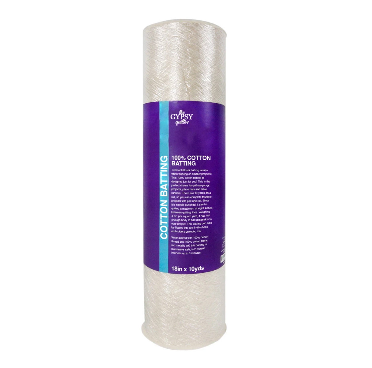 Tired of leftover batting scraps when working on smaller projects? This 100% cotton batting is designed just for you! This the perfect choice for quilt-as-you-go projects, placemats and table runners. There are 10 yards on a roll, so you can complete multiple projects with just one roll. Since it is needle punched, it can be quilted a maximum of eight inches between quilting lines. Weighing 4-oz. per square yard, it has just enough body to add dimension to your project. This batting can also be floated into all out in the hoop embroidery projects, too! This batting is microwave save in 2 minute increments, up to 6 minutes, when you pair with 100% cotton thread and 100% cotton batting. Sold by the yard.